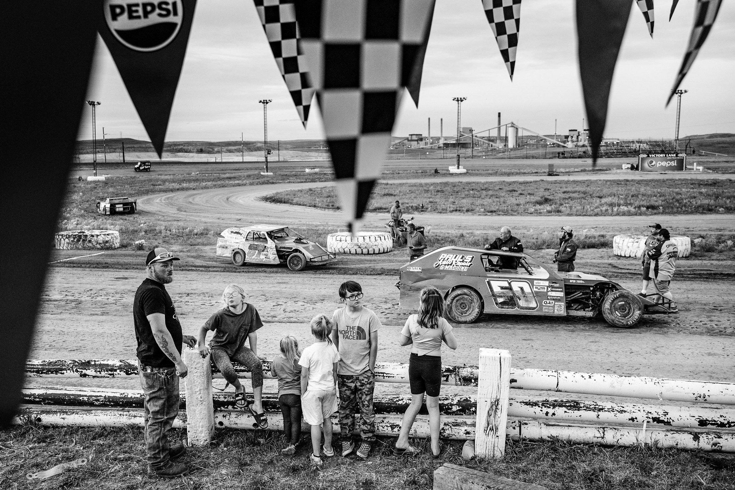 People sit on the guard rail of Gillette Thunder Speedway June 15, 2024, after the candy drop during the 2024, “Pack the Stands” free admission night in Gillette, Wyo. The community came out in droves to watch a mid-season dirt track race and stayed through heavy winds.
