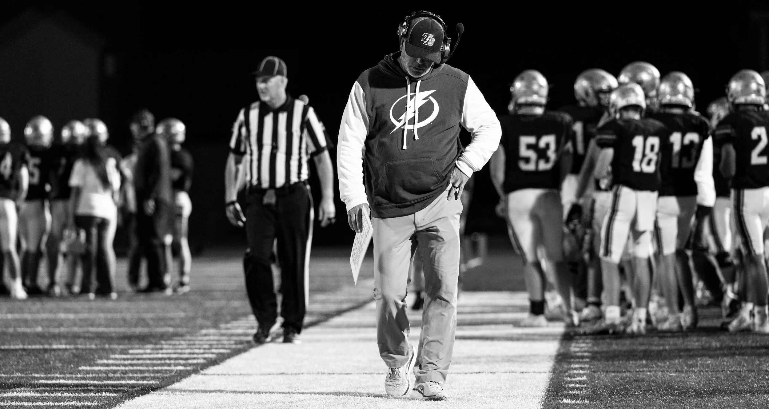 Thunder Basin High School head coach Trent Pikula walks up the sideline with his head hung as his team gets blown out in their first game of the year Aug. 29, 2025, at Thunder Basin High School in Gillette, Wyo. The Bolts ended up losing to Natrona County 37-14 in front of their home crowd and started the season 0-1.