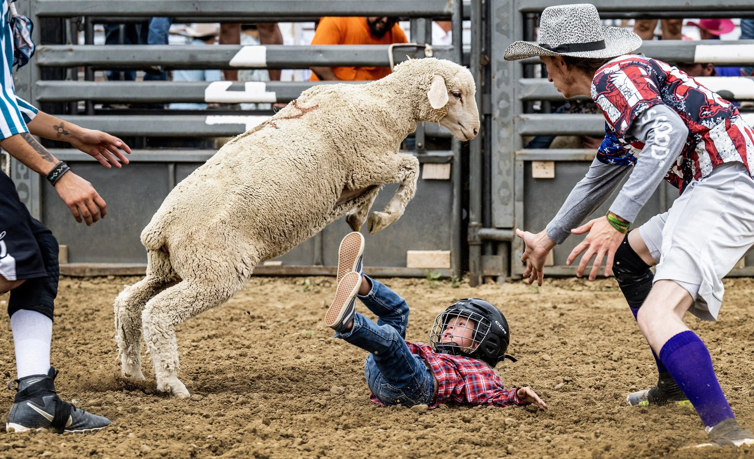 Sage Deaton is thrown from a sheep during the Campbell County Fair Ranch Rodeo mutton bustin' event at Morningside Park in Gillette, Wyo. July 25, 2024.